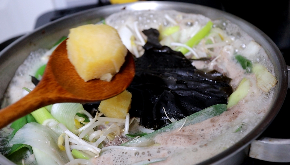 8. 물이 끓기 시작하면 간마늘 2큰술, 국간장 4큰술, 후추 약간, 소금 1큰술을 넣고 같이 끓여줍니다.