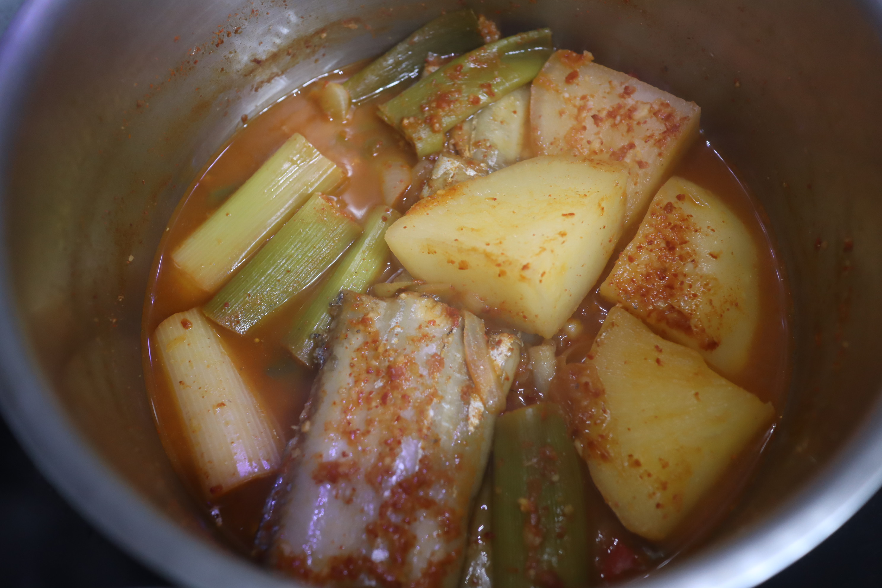 갈치 4조각, 무, 양파, 대파, 청양고추, 홍고추, 다시다, 멸치, 감자(선택)