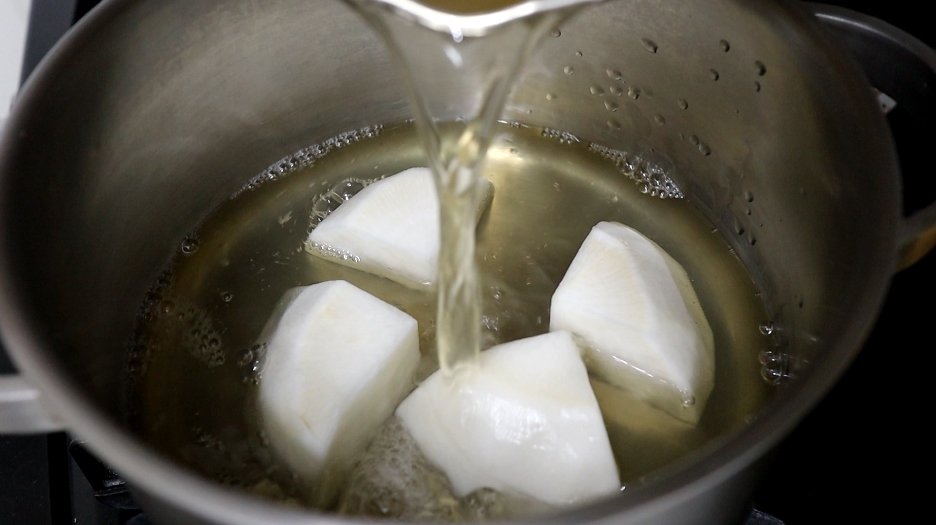 3. 무를 냄비에 넣고 육수를 부어주세요