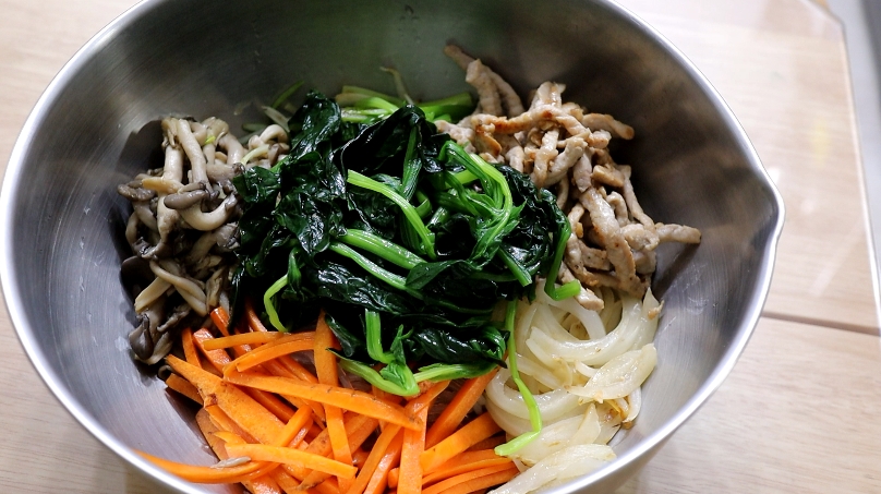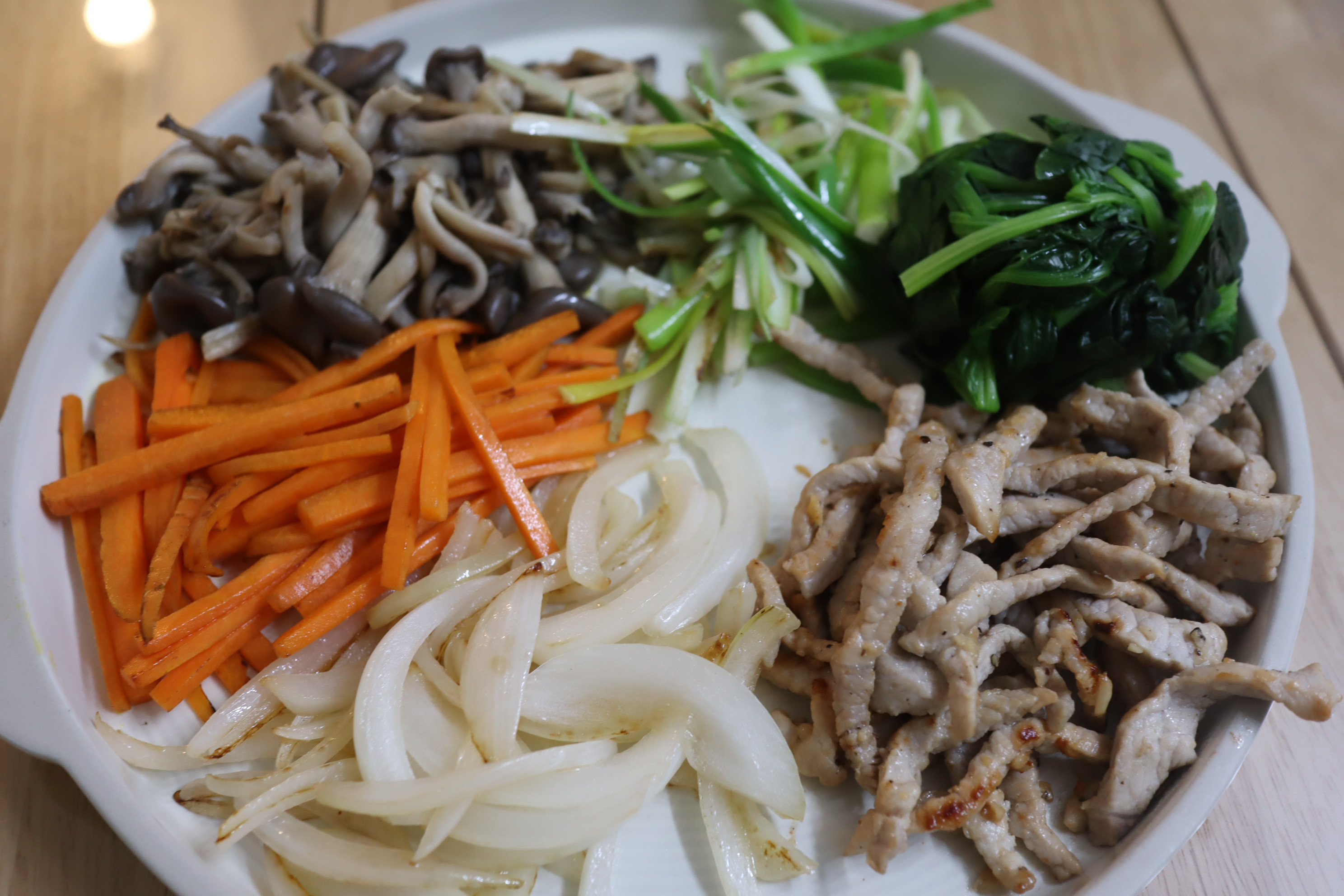 시금치 150g, 잡채용 돼지 고기 110g, 양파 1개, 당근 1/3, 대파 1개, 버섯 1줌 (느타리버섯, 새송이버섯, 목이버섯 가능),당면 250g