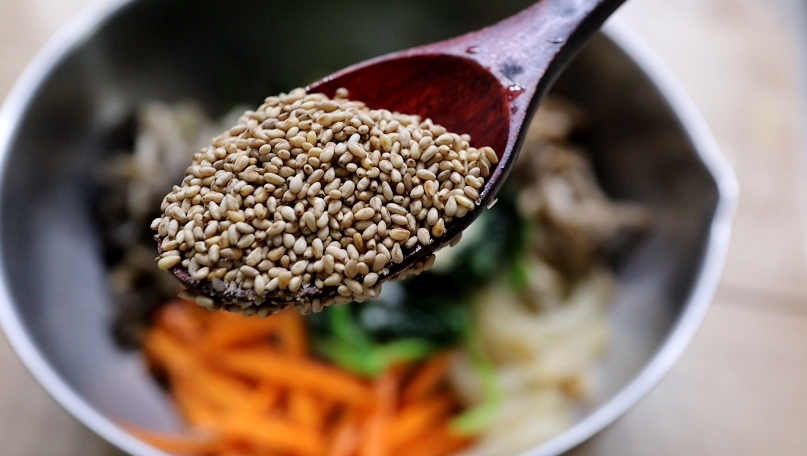 8. 데친 시금치와 다진마늘 1큰술 그리고 통깨 1큰술을 넣어주세요