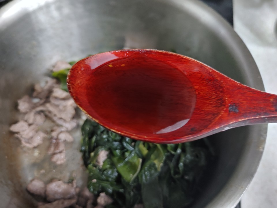 4. 볶은 소고기와 미역에 국간장 3큰술을 넣고 조금 더 볶은 후 물을 넣고 끓여줍니다.