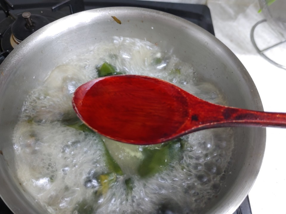 이제 물을 1.3L 정도 넣어주세요~ 그리고 이제 불을 쎈불로 바꿔서 끓여주시면서 다진 마늘 2/3큰술도 넣어줍니다! 이제 거의 완성되었습니다!! 간을 보시고 멸치액젓 1.5큰술 정도로 간을 맞춰주시면 완성입니다!!ㅎㅎ
