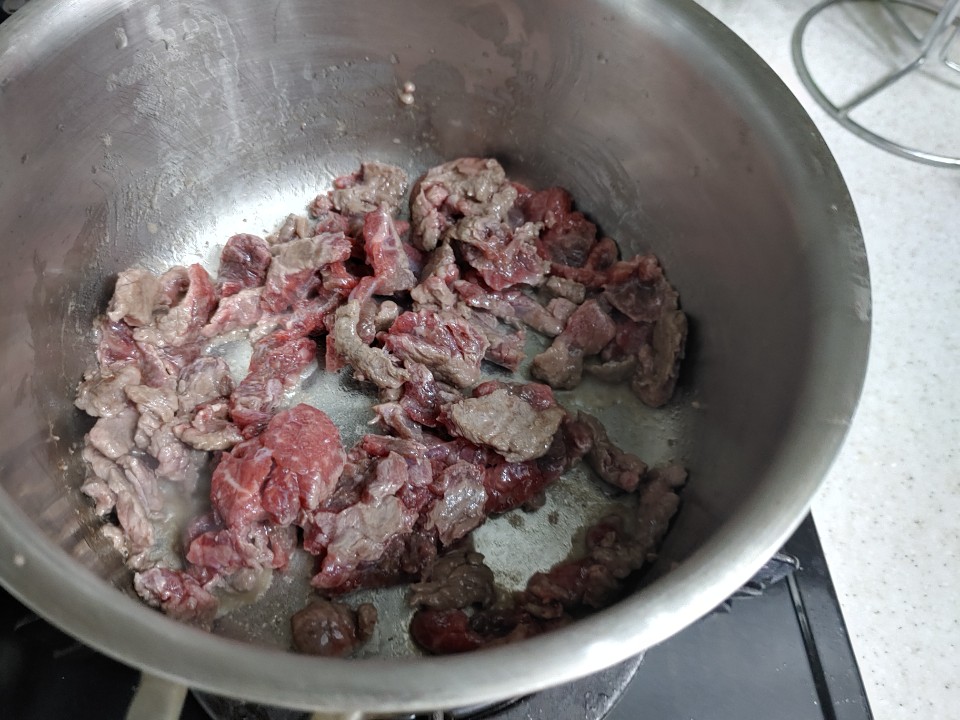 2. 냄비에 참기름을 두르고 소고기를 넣어 중,약불에서 충분히 익을때까지 볶아줍니다.
