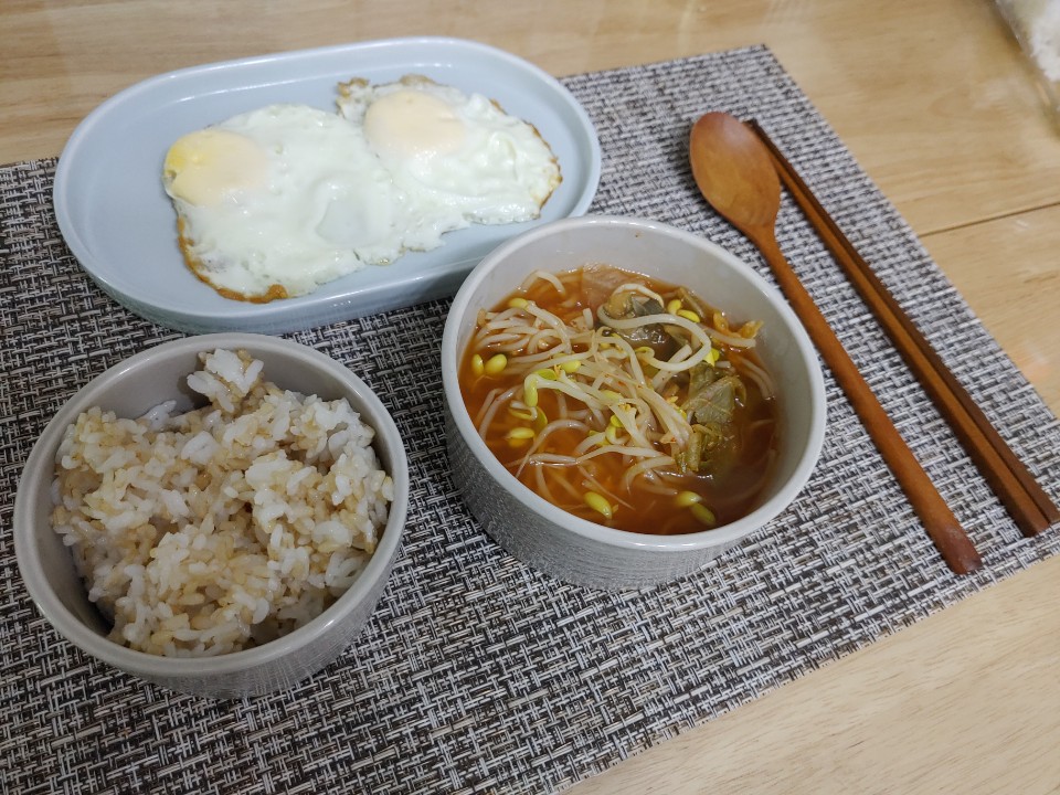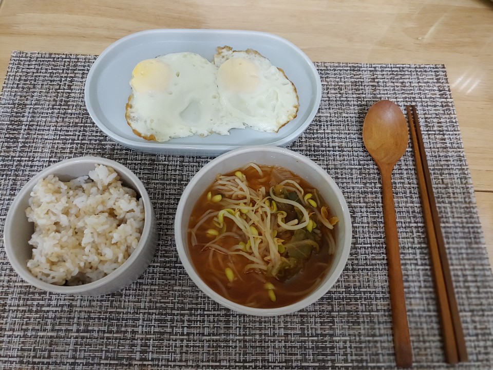 정말 간단하게 계란후라이 2개해서 콩나물 김치국과 밥한공기 뚝딱 해치웠어요~ 너무 시원한 맛이 일품인 백종원의 콩나물 김치국!!! 역시 백선생님입니다!!