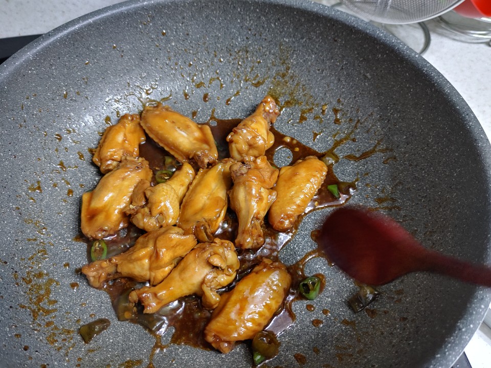 양념이 타지 않게 중약불로 바꿔주시고 국물이 조금 더 졸이면서 청양 고추 1개를 더 추가했어요~ 여기서 한 2~3개 정도 더 추가 해도 좋을 것 같아요.ㅎㅎ 양념이 거의 없어질때까지 졸여주시면 닭날개 닭볶음 조림 완성입니다!
